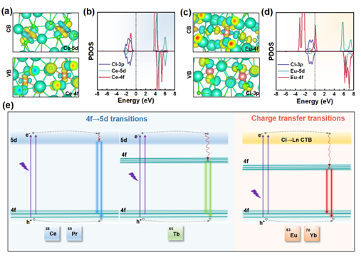 图4. (a) Cs3CeCl6和(c)Cs3EuCl6中导带(上)和价带(下)区域的相关部分电荷密度图。(b) Cs3CeCl6和(d)Cs3EuCl6的PDOS。(e) 提出的Cs3LnCl6(Ln = Ce,Pr,Tb,Eu,和Yb)PL机理示意图。