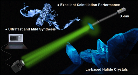 近年来,具有大X射线吸收系数、优异光电性能和溶液可加工性的铅基金属卤化物显示出卓越的闪烁性能,在X射线检测和成像方面具有巨大的前景。然而,铅离子的毒性和小斯托克斯位移所致的自吸收抑制了它们作为闪烁体的大规模应用。具有低毒性、大斯托克斯位移的镧系基金属卤化物被认为是理想的替代材料,然而镧系基金属卤化物的合成面临诸多挑战。镧系离子具有强亲氧性和亲水性,导致其卤化物在混合溶液中的溶解度与其他金属卤化物显著不同,难以通过传统水热法获得高结晶度样品。目前,已报道的高温固相合成或热注入方法虽然能够制备出部分镧系金属卤化物,但是必要的高温条件限制了其进一步发展。因此,开发一种简单、快速且温和的合成方法成为亟待解决的问题。
