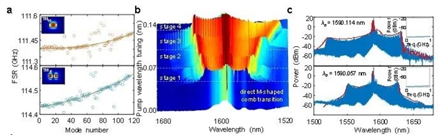 图2:高功率转换效率Platicon微梳。(a)氮化硅芯片色散表征。(b)Platicon微梳光谱动态图。(c)数值仿真与实验测试光谱图