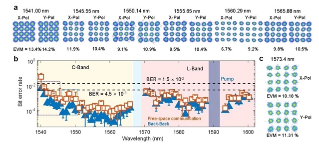 图3:波分复用偏振复用Platicon微梳自由空间相干光通信。(a)相干通信数据恢复星座图。(b)波分复用相干通信误码率分布图。(c)相干通信数据恢复星座图