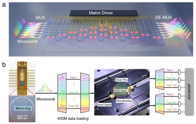 该集成芯片系统包含了集成微腔光频梳,作为芯片级多波长光源子系统;大带宽、低时延、可重构光计算芯片,作为高性能并行计算核心;高精度、大规模、可扩展的驱动芯片,作为光学矩阵驱动子系统;基于该系统,验证了并行度>100的片上光子信息交互与计算原型,在50GHz光学主频下,单芯片理论峰值算力>2560TOPS,功耗比>3.2TOPS/W。