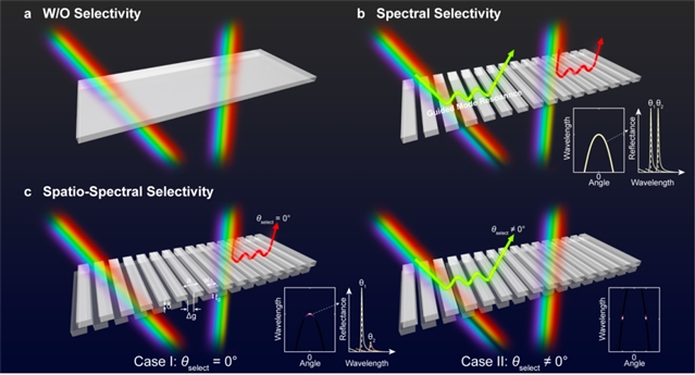 基于这样的物理原理,研究团队在双层超构光栅体系中引入错位自由度。错位既保留了空间反演对称性,同时打破纵向镜面对称性,进而能够对辐射单向性的角度依赖特性进行精细化设计,确保了仅在零角度以及中心波长附近共振反射。类似地,研究团队对一般角度和一般波长的选择性也给出了相应的理论设计。
