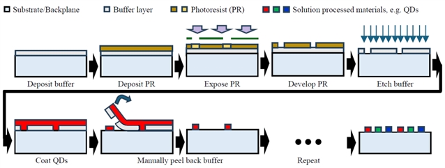 首先在清洁基底上化学气相沉积(CVD)聚对二甲苯层作为缓冲层,然后光刻定义图案,并等离子刻蚀转移至缓冲层,再滴铸量子点溶液形成均匀薄膜,最后机械剥离,撕除缓冲层,仅保留图案化量子点。该流程可循环进行,实现多色量子点的逐层集成。