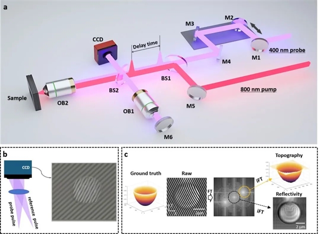 图1: (a)双模态时空显微成像系统示意图,其中红色为中心波长800nm的泵浦光,紫色为400nm的探测光;(b)a中探测臂与参考臂在CCD表面干涉,获取原始干涉图像;(c)双模态图像重建流程。傅里叶变换分别提取零级和一级频谱分量,重建反射率和表面形貌图像