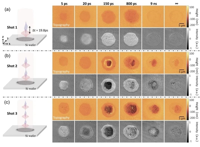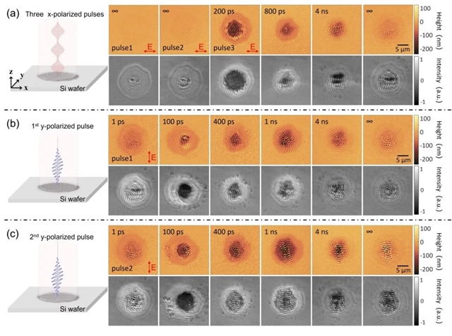 图2:双模态时空成像技术用于研究硅表面在不同正交偏振脉冲对照射下LIPSS形成动力学。左侧示意图展示了硅表面分别受到第一个a、第二个b和第三个c脉冲对照射的情景。a-c图的右上栏显示了每次照射后表面地形的变化,而右下栏显示了反射图像。图中显示的时间对应于泵浦-探测时间延迟
