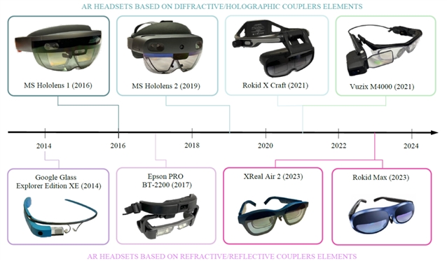 图1:工业AR头显设备技术发展路径:衍射/全息耦合器元件(顶部)和折射/反射耦合器元件(底部)