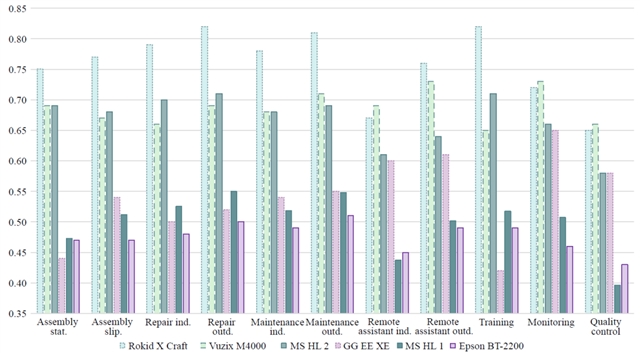 除了客观的数据测试,考虑到工业级AR头显设备是一种以人为本的设备,用户的使用体验评价也十分关键。研究团队通过对11名来自制造企业、具有至少2年专业工作经验且熟悉AR系统的工业代表进行用户调研,对这些设备的人体工程学(重量、操作便利性)及光学效果(色彩均匀性、眩光)进行了评分。