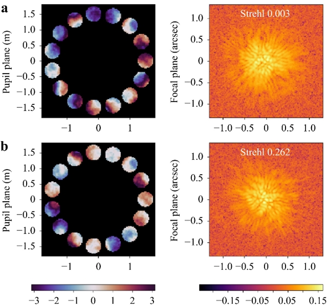寻找系外生命的关键在于将系外行星微弱的光芒从其宿主恒星的耀眼光芒中分离,这要求极高的角分辨率和光度动态范围。SELF和ELF望远镜采用费索干涉(Fizeau interferometry)技术,通过多个子孔径镜面在最终图像平面上实现光束干涉,从而合成一个具有独特衍射图样的望远镜点扩散函数(PSF)。研究强调,通过精确控制每个子孔径的相位,可以动态地在靠近恒星像的位置中创建“暗洞”,极大地衰减恒星衍射光,从而实现对暗弱系外行星的超高对比度成像。此外,研究团队创新性地将机器学习应用于波前测量和校正,通过卷积神经网络实时分析焦平面图像,精确预测并校正镜面活塞、倾斜和倾斜误差,将波前误差控制在纳米级别,确保了干涉成像的精度和稳定性。如图3所示展示了引入机器学习后的结果。这种结合了先进光学设计和人工智能算法的方案,是实现直接成像系外行星的关键创新。