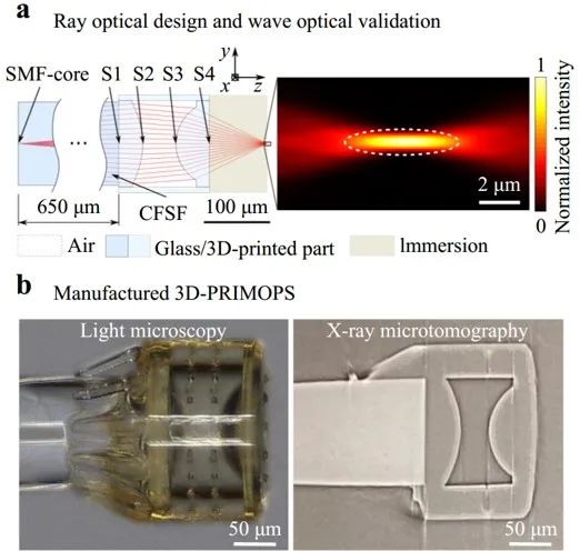 传统的微光学器件制造通常需要经过多个步骤,包括各个光学元件的精确对准、复杂的制造工艺以及精密的封装等。这些步骤不仅耗时耗力,而且容易引入误差,降低器件的良品率。为了克服这些挑战,研究团队利用飞秒激光双光子聚合技术,实现了微型光学器件的一体化成型。团队将双合透镜(含4个光学面,图1a中的S1-S4)和微流体通道精准雕刻成光学系统部分仅125微米的“光学探针”。这种一体化成型的设计,显著简化了制造流程,避免了传统方法中元件对准和封装带来的误差,实现了光路与封装结构的紧密结合,从而大幅提高了器件的良品率。图1b展示了这种三维微纳光学器件的成型结构,并通过X射线显微图像清晰地显示了其优异的无缝封装效果。这种无缝封装对于保证器件在液体环境中的稳定性和光学性能至关重要。