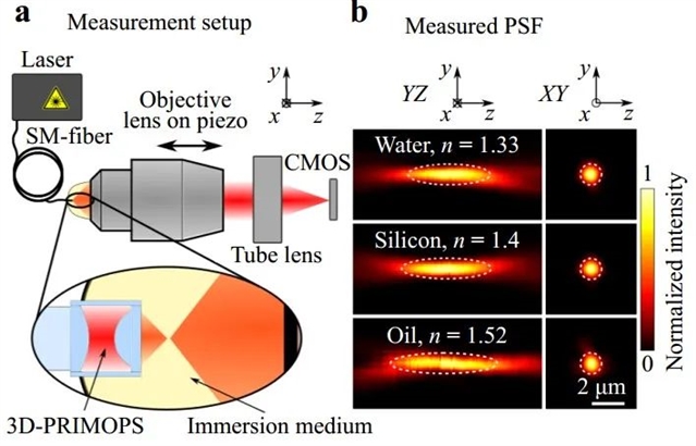 为了验证所提出的制造方法的有效性,研究人员进行了详细的实验测试。如图3a所示,他们搭建了一个实验装置,对制造出的微光学器件在不同液体环境中的成像性能进行了测量。实验结果表明,这种新型微光学器件在水(n=1.33)、硅油(n=1.4)、高折射率浸油(n=1.52)等多种具有不同折射率的液体中,均表现出优异的成像质量。 为了更精确地评估成像性能,研究人员还量化了点扩散函数(PSF)。实验结果显示,在各种液体环境中,微光学器件的有效焦点都达到了衍射极限,这表明其成像性能非常接近理论上的最佳水平。这一结果充分证明了该研究提出的微流体密封技术能够有效地保证3D打印微光学器件在液体环境中实现高性能的成像。