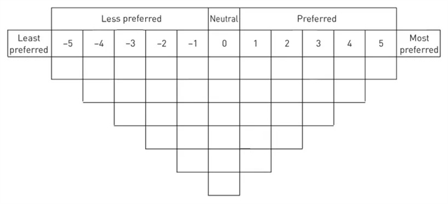 研究团队准备了供受试者打分的正态分布表格,分值范围为-5~5,-5代表最不喜欢,5代表最喜欢,0代表无偏好。受试者需根据个人对图片的审美偏好,在分值表格内填写对应的图片编号。在具体的打分过程中,首先要求受试者将图片分成三组:喜欢的15张,不喜欢的15张,无偏好的6张;然后,要求受试者将图片放入36个空格中,从“最不喜欢”到“最喜欢”进行排列;最后,将图片编号填入表格中,并要求受试者简要阐述最喜欢和最不喜欢图片的理由。