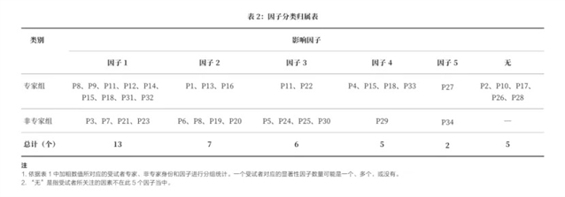 通过对观点相似的受试者进行归类,可以发现专家组和非专家组对不同因子的关注程度(表2):专家组对因子4和因子5关注相对较多,非专家组对因子2更感兴趣,两组对因子3都关注较少,而因子1得到了两组的共同关注。