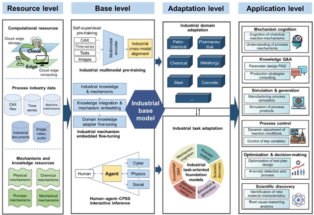 资源层作为基础支撑,整合了三大核心要素:一是涵盖传感器信号、工业图像、工艺文档和CAE文件等多模态数据资源;二是深度融合化学反应机理、物理过程规律等专业知识;三是构建云边协同的计算体系,云端负责大模型训练,边缘端保障实时推理,保证边缘应用过程的实时性。