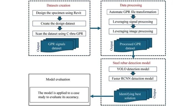 针对传统钢筋混凝土构件检测方法存在的破坏性缺陷,本文提出了一种融合探地雷达(Ground Penetrating Radar, GPR)与深度学习技术的无损检测框架。该框架包括四个阶段:数据集创建、数据集处理、钢筋检测模型和迁移学习,实现了混凝土内部钢筋的自动化识别与直径分类。
