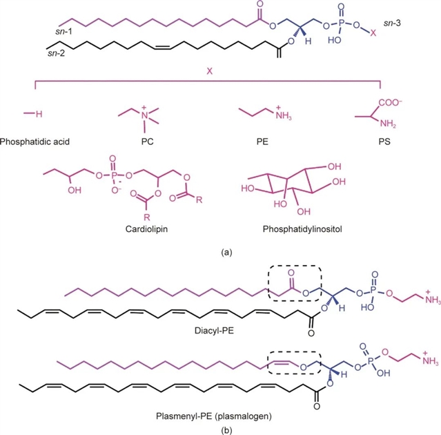 图2 (a)不同头部基团的磷脂结构;(b)PE的两种主要结构。R:脂肪酸;X:头部基团。