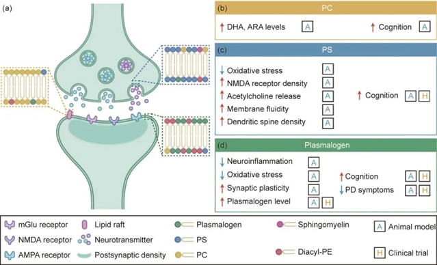 脂质在维持突触可塑性中发挥着重要作用。大脑富含多种脂质,如磷脂酰胆碱(PC)、磷脂酰乙醇胺(PE)、磷脂酰丝氨酸(PS)和缩醛磷脂等,这些脂质不仅构成神经元膜的主要成分,还通过影响膜的黏度、流动性和相关蛋白的功能,进而调节突触传递和可塑性。随着年龄增长,大脑脂质组成发生紊乱,如二十二碳六烯酸(DHA)和花生四烯酸(ARA)含量降低,磷脂成分改变,导致膜流动性和完整性受损,神经递质的转运、释放和接受功能受阻,从而影响大脑功能。