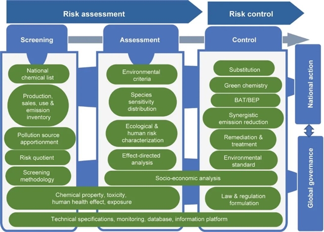 (1)加强与新污染物相关的化学品的清单调查和优先筛选。建立新污染物相关化学品生产、销售、使用与处置清单的数据库。利用计算化学和计算毒理学方法以及人工智能技术,开发可预测新污染物特征、毒性和暴露的可靠模型。建立一个基于环境风险优先筛选为主的信息平台。综合考虑特定环境中新污染物的污染程度、持久性、危害效应、生态和健康风险以及经济和技术因素,动态更新重点管控新污染物清单。