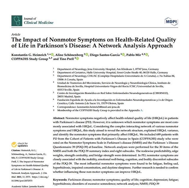 针对帕金森综合征患者非运动症状影响健康相关生活质量 (Health-Related Quality of Life, HRQoL) 进行研究,但具体关联不明的问题,本研究纳入689名西班牙帕金森综合征队列研究患者,基于非运动症状量表 (Nonmotor Symptoms Scale, NMSS) 和帕金森综合征问卷39进行网络分析。