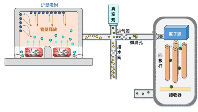 作者在文中提出了水含量分析过程如下图所示,当炉膛密封后加热水从月壤中释放;释放的水蒸气一部分被炉膛管壁吸附,一部分会泄漏出去;如果考虑到水含量过高水完全释放出来超过当前温度到饱和蒸气压,按照设计当水含量大于某一阈值会触发排水阀门打开,该过程是将多余的水蒸气排出;当水蒸气排到一定程度炉膛和管壁的水又会释放出来;当水排到设定阈值后关闭排水阀打开进气阀,剩余水蒸气通过微漏孔进入质谱仪对生蒸气的分压进行分析。