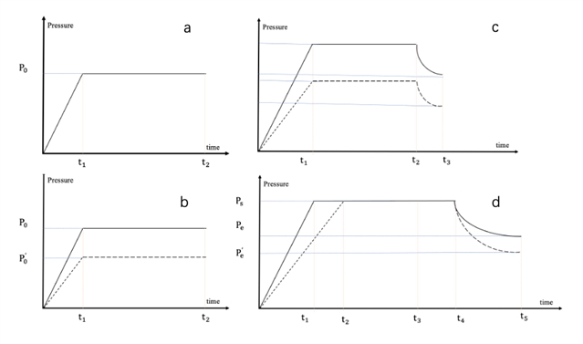 理想气体加热释放的到密闭容腔,该气体的气压的分压如图3a所示,先缓慢增加然后达到平衡。因为水蒸气在金属管壁内具有一定的吸附性,所以水蒸气的实际分压P‘0要低于理论分压P0,如图3b所示。因为水蒸气在常温下(在轨分析温度与室温接近)饱和蒸气压较低,很容易达到饱和,所以当水含量高的时候需要对水进行排出一部分后进行分析,为了避免测量时气压与饱和蒸气压混淆,所以被分析时的水蒸气分压需要远低于当前温度的饱和蒸气压,如果水完全释放出来没有达到饱和蒸气压且需要排出的过程如图3c所示,如果达到了饱和蒸气压如图3d所示。