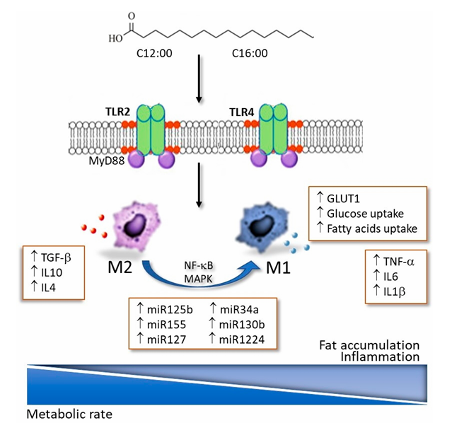 图1. 脂肪堆积与脂肪组织来源的外泌体miRNA在巨噬细胞活化和极化中的相互作用。巨噬细胞从M2表型极化为M1表型导致其分泌的细胞因子从抗炎细胞因子转向促炎细胞因子,包括TNF-α、IL6和IL1β。这种促炎细胞因子的产生是由TLR 2和4的激活所驱动的,而饱和脂肪酸水平升高会刺激TLR 2和4的激活。