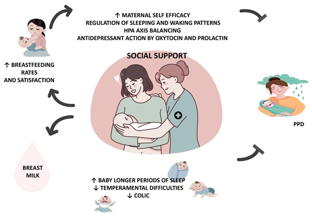 图1. 产后医疗保健和社会支持、母乳喂养与产后抑郁症风险的关系。缩写:↓ 降低,↑ 升高。