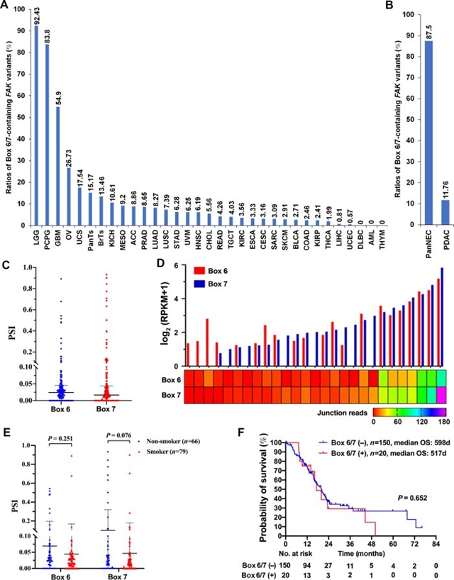 图1 癌症基因组图谱泛癌数据集及胰腺肿瘤中含Box 6/7的黏着斑激酶剪接变体情况