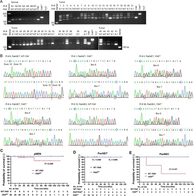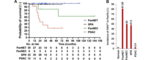 为验证癌症基因组图谱数据的结论,研究团队收集了157例我国胰腺肿瘤患者的临床样本,通过反转录聚合酶链反应(RT-PCR)和Sanger测序检测FAK6/7的表达。结果显示,胰腺神经内分泌肿瘤(pNEN)患者中FAK6/7的阳性率高达75.6%,其中高分化胰腺神经内分泌瘤(PanNET)的阳性率更达81.1%;胰腺实性假乳头状瘤(SPN)患者的阳性率为47.5%;而胰腺导管腺癌患者仅2.9%(图2)。值得注意的是,FAK6/7的表达与患者性别、年龄、吸烟状态及TNM分期无显著相关性,但在胰腺神经内分泌癌亚组中,FAK6/7阳性患者的总生存期呈现缩短趋势(图3)。