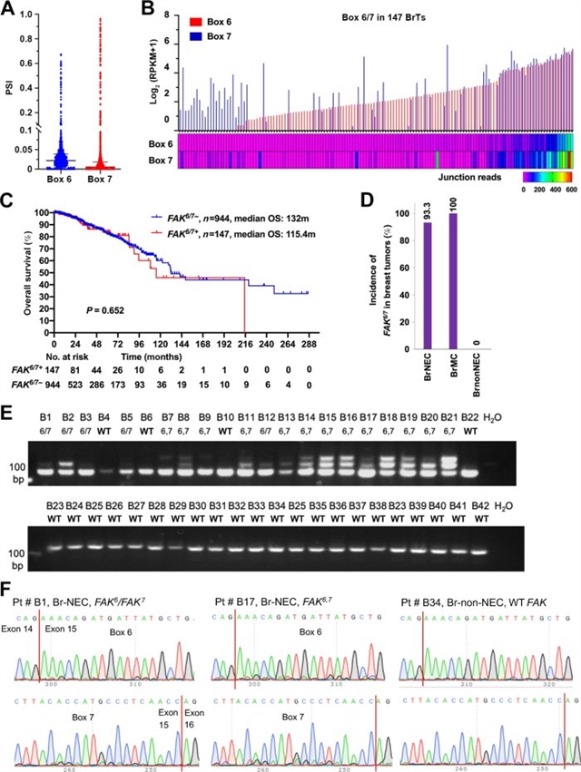 为进一步验证FAK6/7与神经内分泌肿瘤的关联,研究团队扩展至乳腺肿瘤领域。癌症基因组图谱数据库中1092例乳腺癌样本分析显示,FAK6/7在乳腺神经内分泌癌(BrNEC)中的阳性率为100%,在乳腺混合癌(BrMC)中为100%,而在乳腺非神经内分泌癌(BrnonNEC)中仅为13.3%。临床样本验证结果更明确:15例乳腺神经内分泌癌样本中14例检测到FAK6/7,4例乳腺混合癌样本全部阳性,而23例乳腺非神经内分泌癌样本均未检测到(图4)。这一结果进一步支持FAK6/7与神经内分泌肿瘤的密切关联。