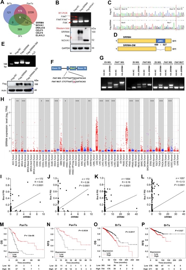 在机制探索方面,研究团队通过差异表达基因分析筛选出6个可能调控黏着斑激酶剪接的候选剪接因子,其中丝氨酸/精氨酸重复矩阵蛋白4(SRRM4)在FAK6/7阳性的胰腺及乳腺肿瘤中显著高表达。功能实验显示,过表达SRRM4可诱导293T细胞中FAK6/7的形成,而缺失其微外显子增强结构域(eMIC)的SRRM4突变体则失去这一功能。进一步通过黏着斑激酶微基因剪接实验证实,SRRM4通过识别Box 7上游的UGC基序促进FAK6/7的剪接。此外,癌症基因组图谱数据显示SRRM4的表达与胰腺肿瘤中FAK6/7的剪接指数(PSI)呈正相关,而在乳腺癌中相关性较弱;生存分析提示,SRRM4高表达与胰腺肿瘤患者的总生存期和无复发生存期改善相关,但与乳腺癌患者的生存预后呈负相关(图5)。
