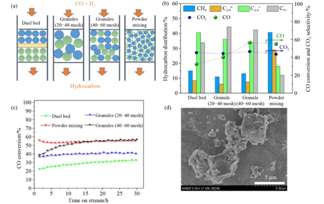 综上所述,通过优化操作条件(空速27000 mL·g-¹·h-¹、压力1.0 MPa、温度340 ℃)、采用40-60目颗粒混合负载方式及1:7质量比,复合催化体系可有效提升低碳烯烃的选择性;同时明确了SAPO-34强酸位点的双重作用——适量促进裂解、过量引发副反应,为设计高效FTO复合催化剂提供了理论依据。