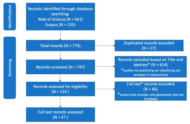 本研究主要借助HubMeta软件,从Web of Science (WoS)和Scopus这两个数据库中进行系统检索,选取与低地DMS研究相关的741篇论文,去重后经过标题与摘要筛选发现有133篇论文符合要求,最终经过对这些论文的全文审查发现有67篇完全符合标准 (本文所有数据分析均基于最终筛选的67篇论文)。