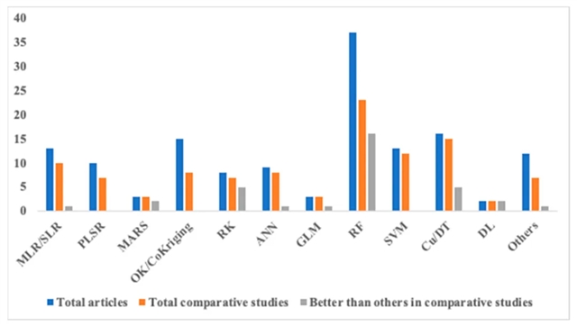由于土壤系统的复杂性,选择合适的模型至关重要。研究者通常会根据研究区域的具体情况和数据的特点来选择不同的模型。低地DSM研究主要包括传统统计法 (MLR, PLSR等)、地理空间及多元地理统计法、统计机器学习法 (RF, SVM, Cubist (Cu), DT, DL等) 和混合模型法 (RK, RFRK等),其中统计机器学习法应用最为广泛,尤其是随机森林 (RF) 模型,更为可靠稳定,能够处理复杂的数据关系,提高预测精度 (图6)。
