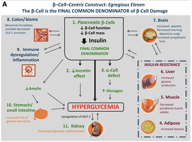 图 1.以 β 细胞为中心的惊人十一因子:β 细胞功能障碍是糖尿病的最终共同点。