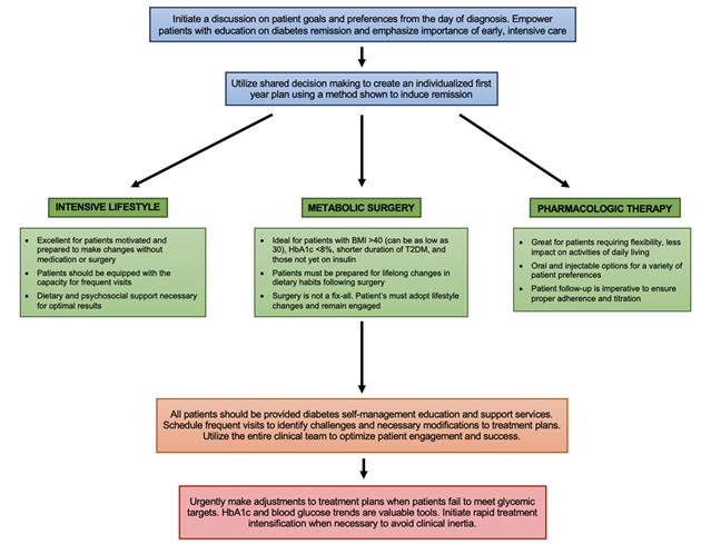 药物干预:早期联合用药(如二甲双胍 + 吡格列酮 + 艾塞那肽)3 年 HbA1c<6.5% 的比例达 67%;短期强化胰岛素治疗 12 个月无药缓解率约 46%,且门诊应用安全可行。