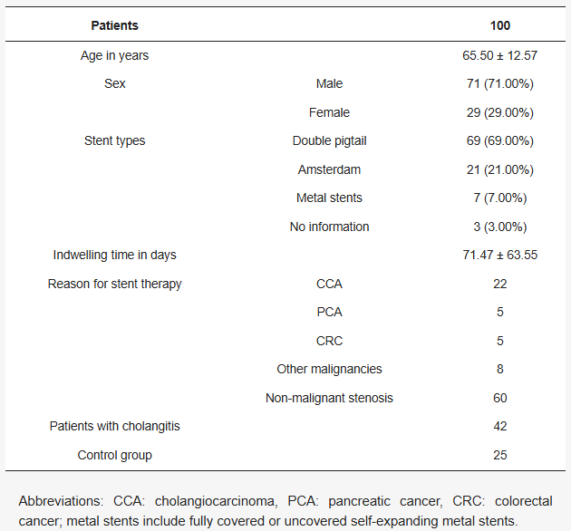 本文共分析了来自100名不同患者的100个支架。患者分为恶性肿瘤组 (40例,包括22例胆管癌)、手术和肝移植导致的狭窄及其他疾病组 (60例)(表1),以及非炎症对照组 (25例)。支架在ERC期间收集并保存于4 °C,用无核酸酶水冲洗后冷冻。总RNA包括miRNA从支架洗脱液中提取,并进行定量实时PCR分析。表1 接受支架治疗的患者特征