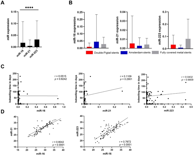 本研究基于经验选择了与肿瘤 (miR-21) 和炎症 (miR-223) 相关的miRNA,并使用miR-16作为标准化参考。预分析评估显示 (图1),所有miRNA均可从胆管支架中检测,其中miR-223水平最高,其次是miR-16,miR-21最低。所有miRNA均表现出一定程度的变异。支架类型和留置时间对miRNA水平无显著影响。miR-16与miR-21和miR-223呈正相关,但因其与肿瘤细胞相关,未用作标准化物。研究发现,恶性疾病患者中miR-16和miR-223水平升高,miR-21无显著变化 (图2)。胆管炎患者miRNA水平与非炎症患者有显著差异,miR-16、miR-21和miR-223水平显著增加,表明支架环境变化可能与miRNA变化直接相关 (图3)。进一步研究显示,miR-16、miR-21和miR-223与胆汁淤积标志物正相关,未发现与CRP相关性,提示胆汁淤积和支架功能障碍可能影响miRNA水平。