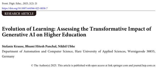 德国哈尔茨应用技术大学 Stefanie Krause 等在Frontiers of Digital Education(《数字教育前沿(英文)》)期刊上发表了一篇题为Evolution of Learning: Assessing the Transformative Impact of Generative AI on Higher Education的文章,通过混合研究方法,结合实证调查与情景分析,旨在揭示 GenAI 在高等教育中的真实作用,并为其合理应用提供科学依据。