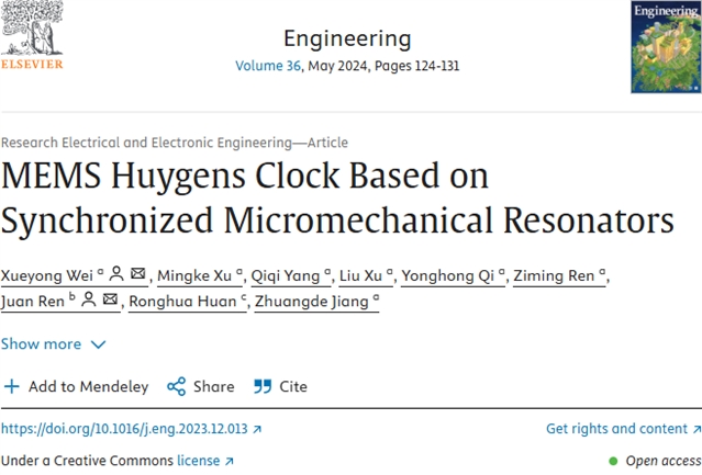论文信息:Xueyong Wei, Mingke Xu, Qiqi Yang, Liu Xu, Yonghong Qi, Ziming Ren, Juan Ren, Ronghua Huan, Zhuangde Jiang. MEMS Huygens Clock Based on Synchronized Micromechanical Resonators. Engineering, 2024, 36(5): 124–131
