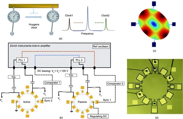 针对MEMS振荡器在短期稳定性和长期稳定性提升的技术难点,研究团队构建了一个由两个微机械谐振器组成的MEMS惠更斯时钟,其中两个谐振器的振荡信号相互注入,并通过调节其中一个振荡器的频率来实现同步。