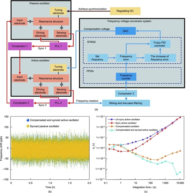 同步后,两个谐振器的短期稳定性得到了改善,其Allan方差从19.3 ppb@1 s降低至5.17 ppb@1 s,稳定性提升了3.73倍。此外,研究团队采用基于焦耳热的频率补偿系统,通过改变谐振器的导通电流来控制焦耳热,以补偿由于温度变化引起的MEMS振荡器频率漂移。相比于以往使用大功率热源的主动补偿方式,该补偿系统在 2.85 mW/℃的条件下显著提升了振荡器的长期稳定性,通过采用模糊PID控制,其长期稳定性提升了 452 倍,Allan 方差达到0.752 ppb@300 s。