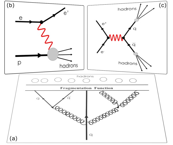 (a)部分子碎裂至强子过程示意图,(b)电子-质子半单举深度非弹性散射过程示意图,(c)正负电子湮灭过程示意图。