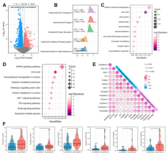 RNA-seq分析发现,SCARNA12的高表达与细胞周期相关的信号通路,如G2/M检查点和E2F靶点信号通路富集相关。这些结果表明,SCARNA12可能通过调控细胞周期与细胞粘附相关基因的表达,促进膀胱癌细胞的增殖与转移。GO功能富集分析进一步证实,SCARNA12的高表达与细胞外基质(ECM)信号通路密切相关,影响BLCA的细胞行为(图2)。
