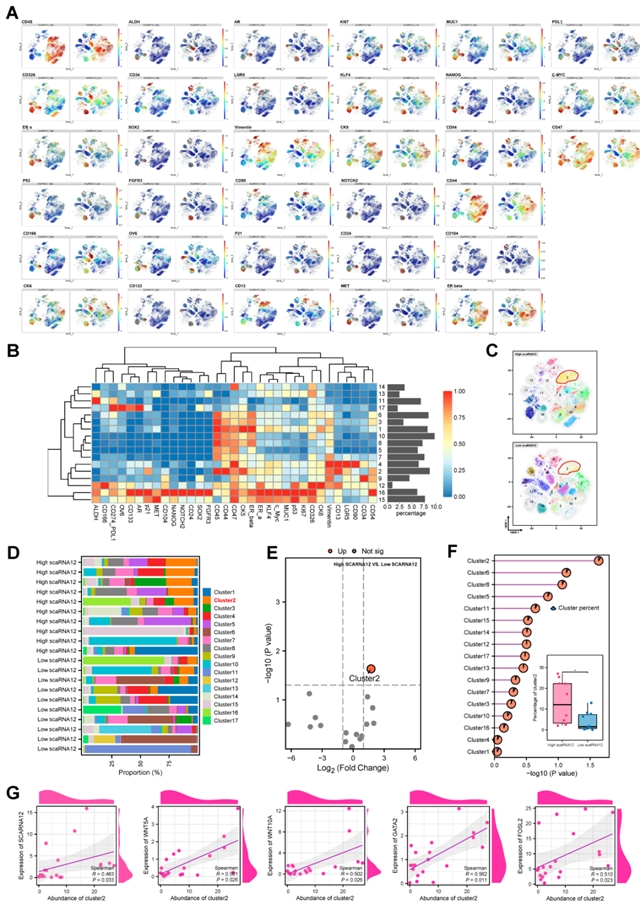 利用CyTOF进一步分析,发现高SCARNA12表达的BLCA样本中,ECM相关细胞簇显著富集。这些细胞簇表现出较高的vimentin、CD13、CD44和CD47等标志物的表达,提示SCARNA12可能通过影响ECM信号传导,调节肿瘤微环境中的细胞行为(图3)。