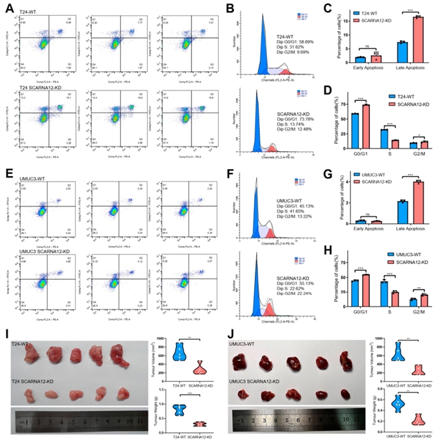 研究团队进一步在T24和UMUC3膀胱癌细胞系中敲低SCARNA12,发现SCARNA12的敲低显著抑制了细胞的增殖、克隆形成、迁移和侵袭能力。流式细胞术分析表明,SCARNA12敲低后,膀胱癌细胞的晚期凋亡比例显著增加,细胞周期阻滞在G1/G0和G2/M期,表明SCARNA12敲低可能通过诱导细胞周期停滞,抑制膀胱癌细胞的增殖(图4-5)。