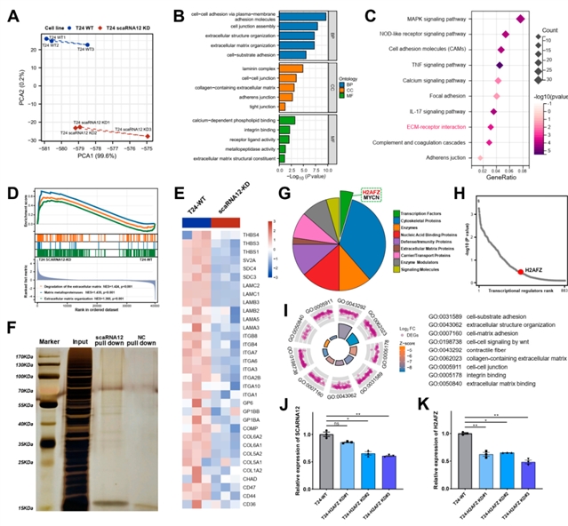 研究团队通过ChIRP-MS分析,发现SCARNA12与转录因子H2AFZ等多种核酸结合蛋白、酶调节因子有直接的相互作用。进一步实验表明,H2AFZ敲低后,SCARNA12的表达水平显著下降,提示SCARNA12可能与H2AFZ协同调控ECM相关基因的表达,从而促进膀胱癌的发展(图6)。