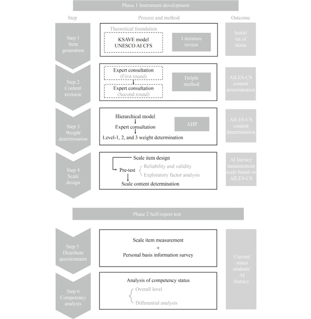 研究分为“工具开发”与“实证检验”两个阶段。在工具开发阶段,团队首先通过文献梳理与理论整合,构建了包含4个一级指标(人工智能态度、人工智能知识、人工智能能力、人工智能伦理)、10个二级指标及25个三级指标的初步框架。随后采用德尔菲法邀请人工智能领域专家进行两轮咨询,优化指标内容与权重,并通过层次分析法确定各级指标权重。基于该框架,研究开发了31题项的李克特五点量表,并通过预测试与信效度分析验证了量表的可靠性与结构效度。