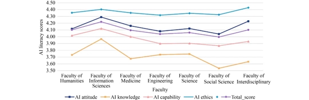 实证部分,研究以武汉大学1651名本科生为样本,通过问卷调查分析人工智能素养的整体水平与群体差异。结果显示,学生人工智能素养总平均分为4.105(满分5),呈现中等偏上水平,但各维度发展不均衡:人工智能伦理得分最高,反映出学生对隐私保护、算法偏见等伦理问题的较高认知;人工智能知识得分最低,表明基础知识掌握不足,可能与课程设置中人工智能概念的系统性教学缺失有关。