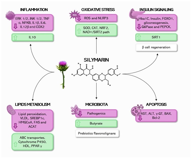 图 2. 总结水飞蓟素 ( Silybum marianum (L.)) 在肥胖和代谢紊乱中针对的主要途径,强调其对抗炎和抗氧化作用、胰岛素敏感性、增强脂质代谢、调节细胞凋亡和重塑微生物群的影响。