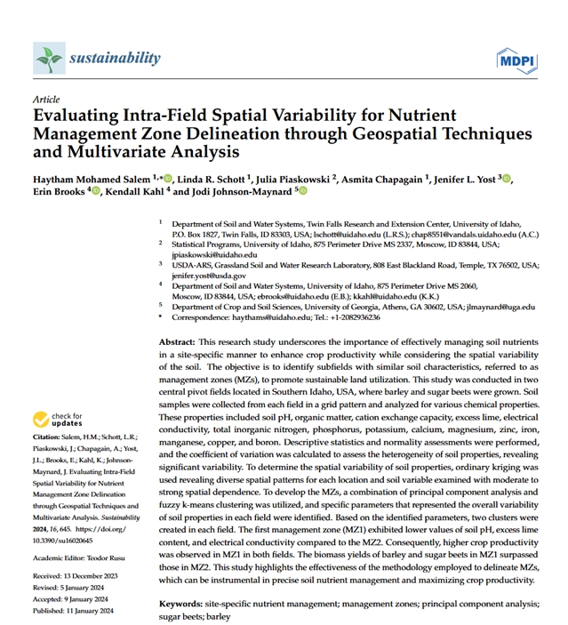 中文标题:利用地理空间技术和多变量分析评估养分管理区划定的田间空间变异性